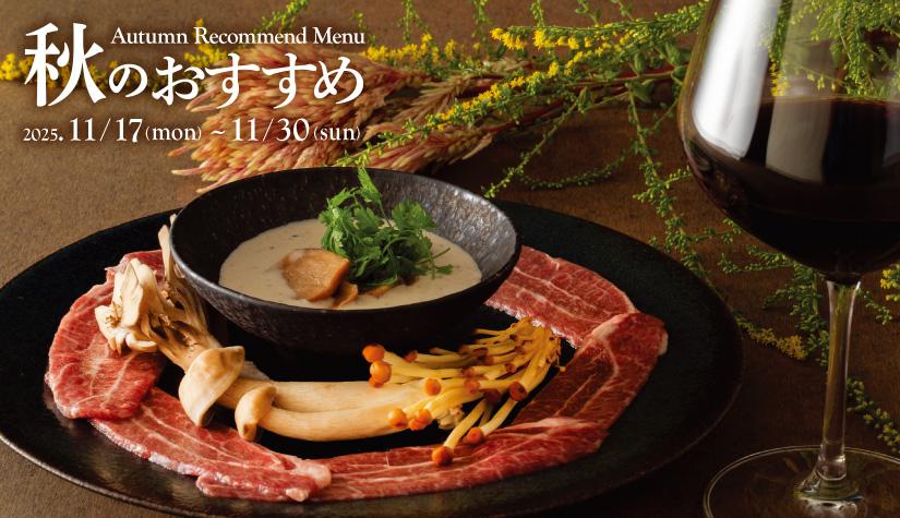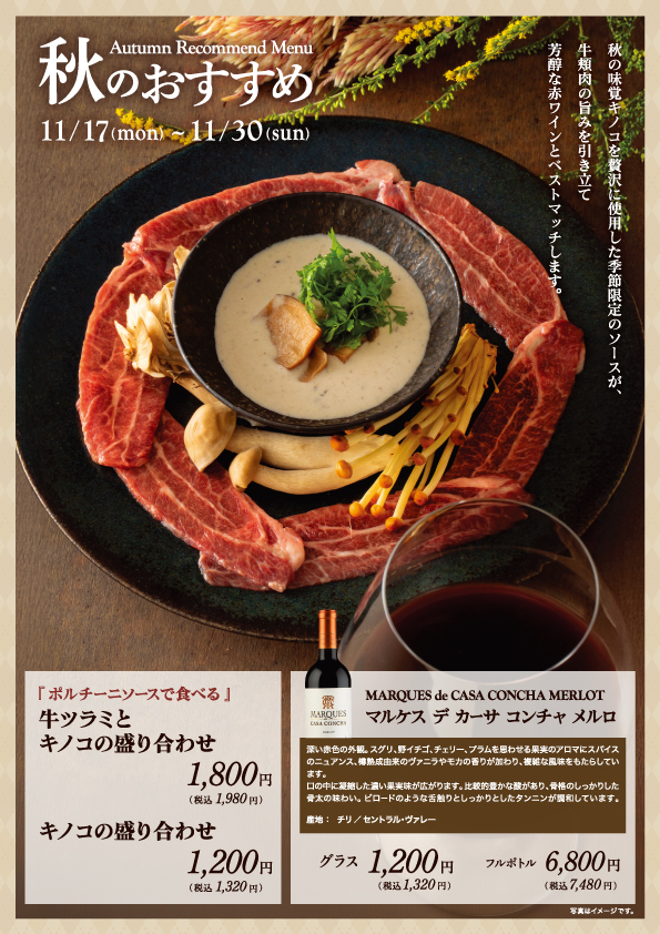 秋のおすすめとして、おすすめのワインとワインに合うメニューを販売いたします。