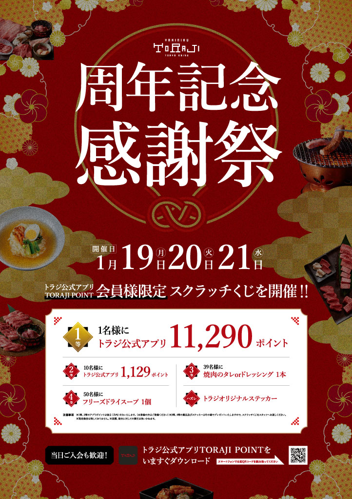 この機会に是非、トラジ公式アプリTORAJI POINTの会員になって、周年祭店舗へご来店ください!
